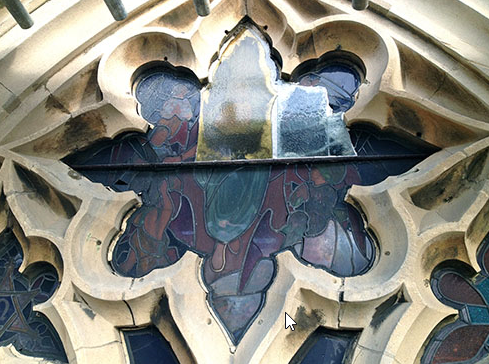 Upon previous close inspection, Kenton Brauer reported that the West main tracery, whilst masked with dirt, silicone & putty, was precariously bulging away from the stonework with glass sections jutting away from their lead, calling for urgent removal & restoration (left). The stained light was damaged overtime due to movement in the stonework above and weathering which has made the whole window distort and cause the glass to fracture. In response, major works took place to the inside stonework above the tracery to prevent any further movement and to protect the restored stained light for the future.