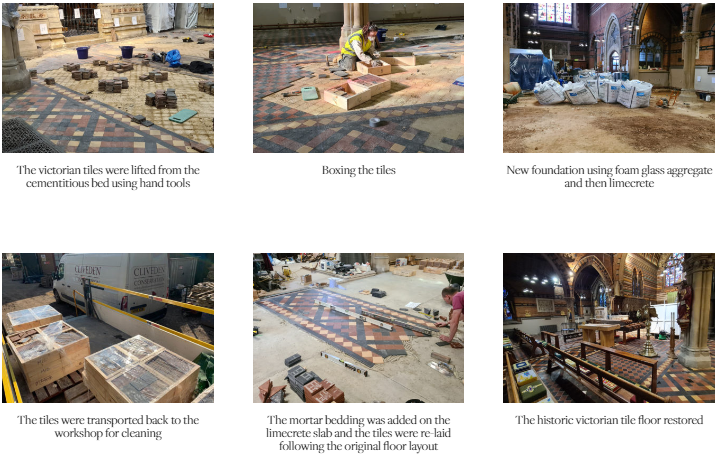 Re-laying the tiles required complete accuracy to match the original pattern of the floor. Diagonally laid black and red tiles framed by contrasting bands of triangular and rectangular tiles delineate the central aisle and areas between the piers.
